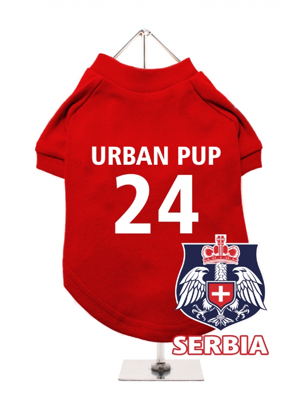 Support Serbia with this customisable dog t-shirt, featuring a custom Serbia crest with a double-headed eagle. The t-shirt can be personalised with your dog's name and team number. Made from soft, breathable fabric, it ensures your dog's comfort. It’s easy to clean, being machine washable. Ideal for showing off your dog's Serbian pride, it's great for any occasion.