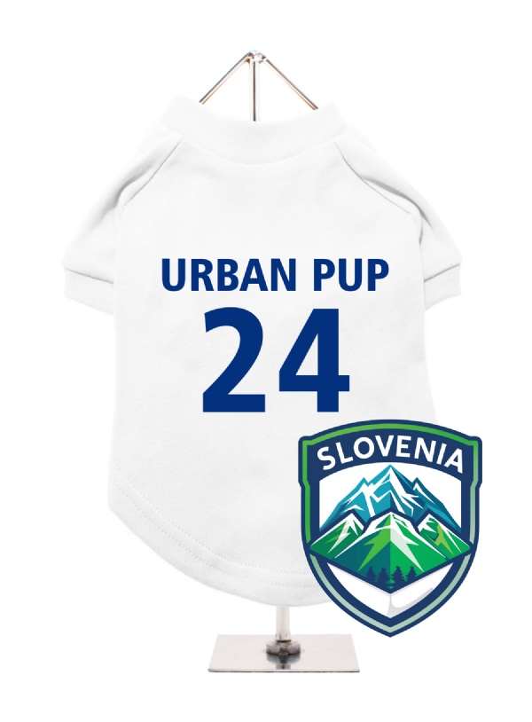 Celebrate Slovenia with this customisable dog t-shirt, featuring a Slovenia badge with mountains. Personalise it with your dog's name and team number. Made from comfortable, airy fabric, it keeps your dog comfortable. It’s easy to wash and machine washable. Ideal for displaying your dog's Slovenian pride, it's perfect for any occasion.