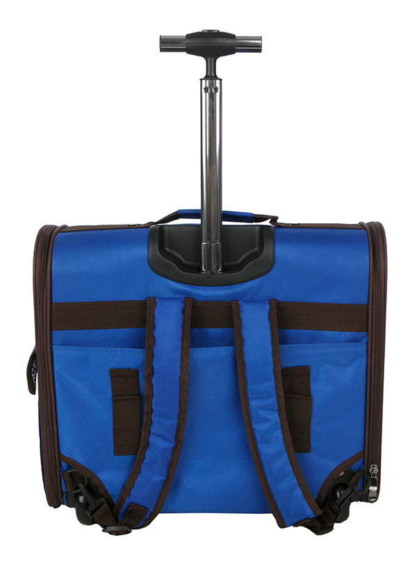This Blue Travel Carrier is an amazing fantastic versatile item. You will wonder how you managed without it. When you extend the telescopic handle it can be used as a wheeled carrier and can be pulled along on its wheels, just like a regular suitcase, the only difference this time is that the contents are more precious. It can also be used as a backpack using the shoulder straps at the rear and if you are feeling particularly strong it can be carried underarm using the handle on top of the carrier. Both sides have a zip opening with netting on each side for good air circulation. The front has a large flap which can be raised to allow for even more air circulation and while he/she can see out it is not so easy for passers-by to see in. The interior features a lead that will attach to a collar or harness so when the door is opened the dog cannot make a run for it until you have control. Also another feature is an animal print design with a removable mat for easy cleaning.