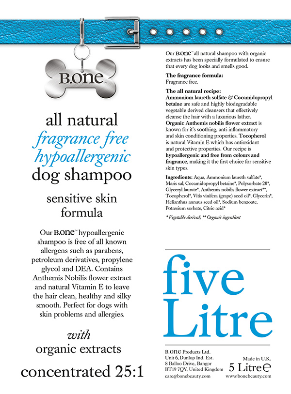 Our hypoallergenic shampoo contains safe and highly biodegradable, vegetable derived cleansers that effectively cleanse the hair with a luxurious lather. It is free of all known allergens such as parabens, petroleum derivatives, propylene glycol and DEA. Contains Anthemis Nobilis flower extract which is known for it's soothing, anti-inflammatory and skin conditioning properties including natural vitamin E. It will leave coats clean, healthy and silky smooth without stripping the coat of natural oils. Our recipe is hypoallergenic and free from colours and fragrance, making it the first choice for sensitive skin types, perfect for dogs with skin problems and allergies.