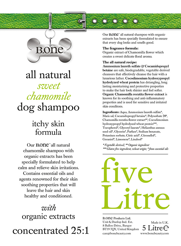 Our Chamomile shampoo is perfect for dog's who suffer from itchy or irritated skin as it contains highly biodegradable, vegetable derived cleansers including wheat protein which has conditioning, long lasting moisturising and protective properties to make the hair look shinier and feel softer and also helps to detangle. Chamomilla recutita flower extract is known for its soothing and anti-inflammatory properties and is used in sensitive and irritated skin products. It will gently cleanse the coat leaving it healthy and conditioned without removing any healthy oils from the coat. It will gently cleanse the coat leaving it healthy and conditioned without removing any healthy oils from the coat.